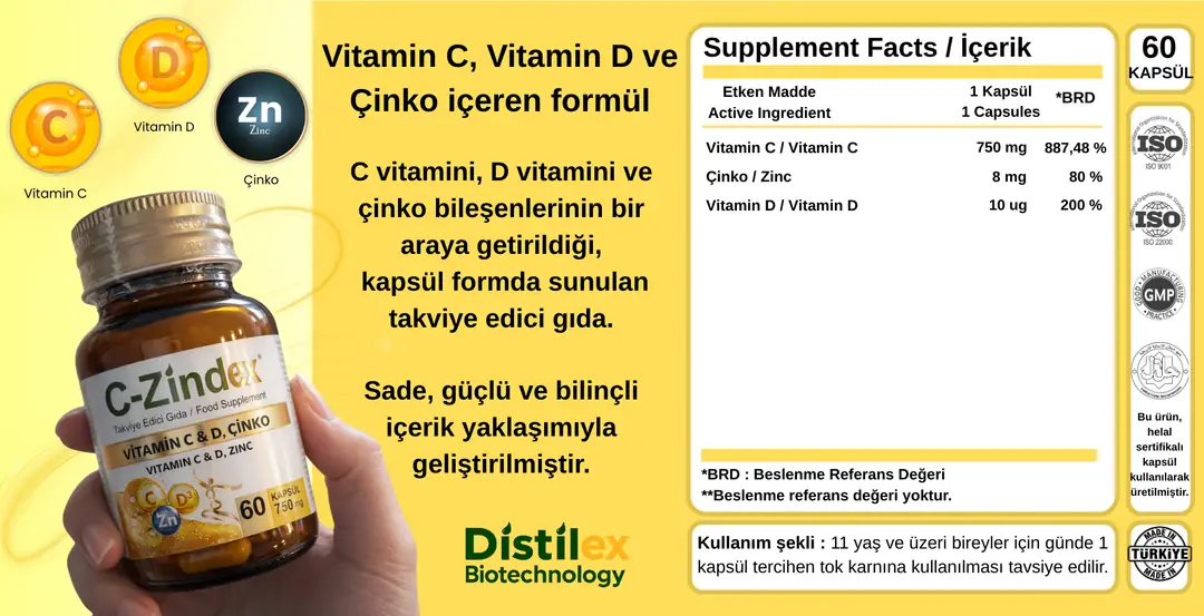 C-Zindex®, C vitamini, D vitamini ve çinko içeren bir takviye edici gıdadır. Bu bileşenlerin bir araya getirildiği formül, kapsül formda sunulmaktadır.