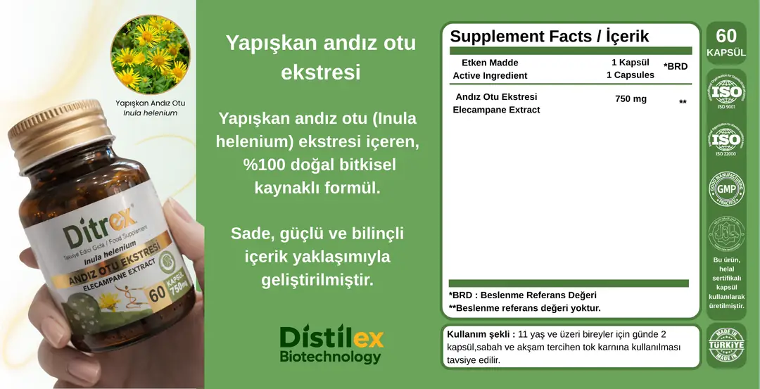 Ditrex®, yapışkan andız otu ekstresi (Inula helenium) içeren, normal beslenmeyi takviye etmek amacıyla formüle edilmiş %100 doğal takviye edici gıdadır. Günlük beslenmeyi desteklemek üzere kapsül formda sunulmaktadır.