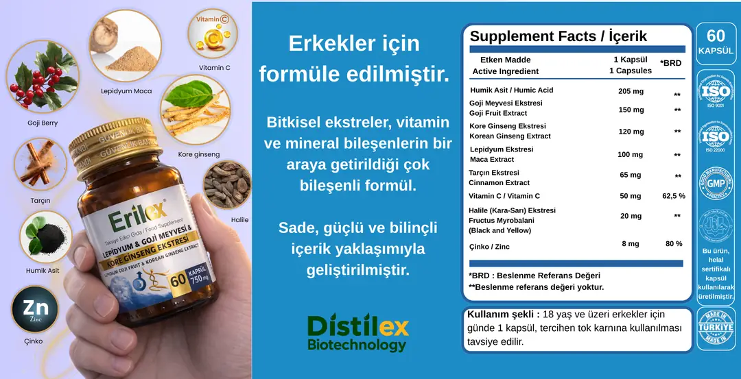 Erilex®, 18 yaş ve üzeri erkekler için geliştirilmiş, çok bileşenli normal beslenmeyi takviye etmek amacıyla besleyici veya fizyolojik etkileri bulunan %100 doğal takviye edici gıdadır.