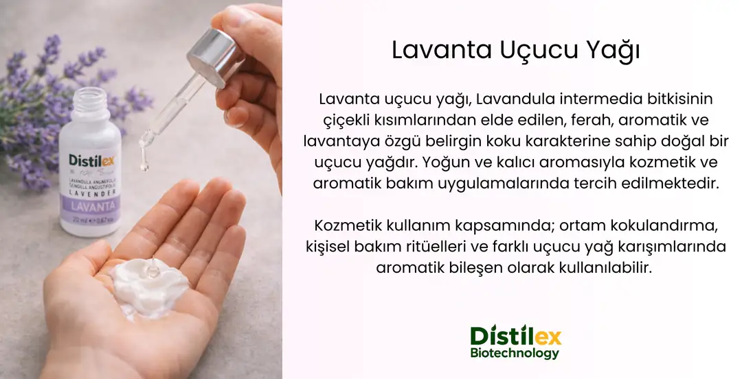 Lavanta uçucu yağı, Lavandula intermedia bitkisinin çiçekli kısımlarından elde edilen, ferah, aromatik ve lavantaya özgü belirgin koku karakterine sahip doğal bir uçucu yağdır. Yoğun ve kalıcı aromasıyla kozmetik ve aromatik bakım uygulamalarında tercih edilmektedir.
