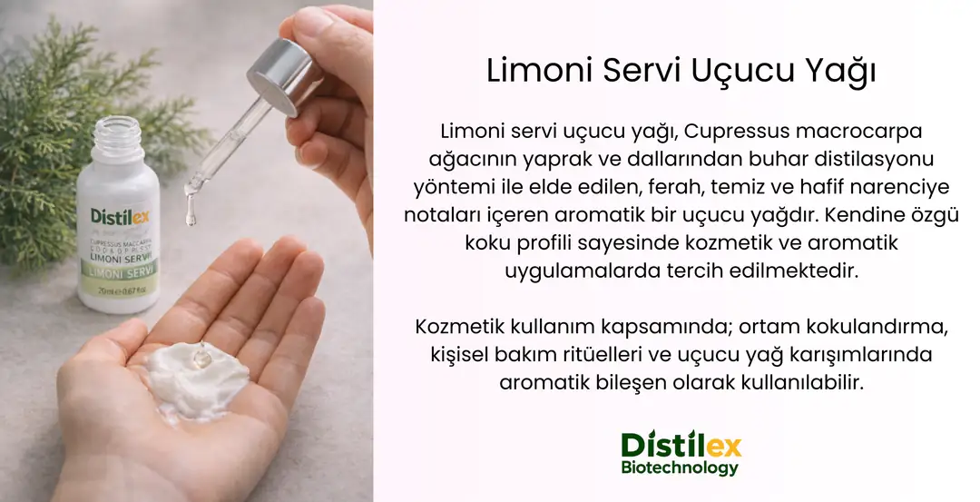 Limoni servi uçucu yağı, Cupressus macrocarpa ağacının yaprak ve dallarından buhar distilasyonu yöntemi ile elde edilen, ferah, temiz ve hafif narenciye notaları içeren aromatik bir uçucu yağdır. Kendine özgü koku profili sayesinde kozmetik ve aromatik uygulamalarda tercih edilmektedir.