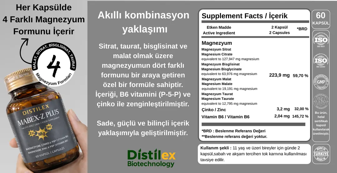 Mabex-Z Plus, Magnezyum Kompleks (Taurat,Bisglisinat,Malat,Sitrat) 60 Kapsül Vitamin B6 (p5p) ve Çinko İçeren 60 Kapsül Takviye Edici Gıda